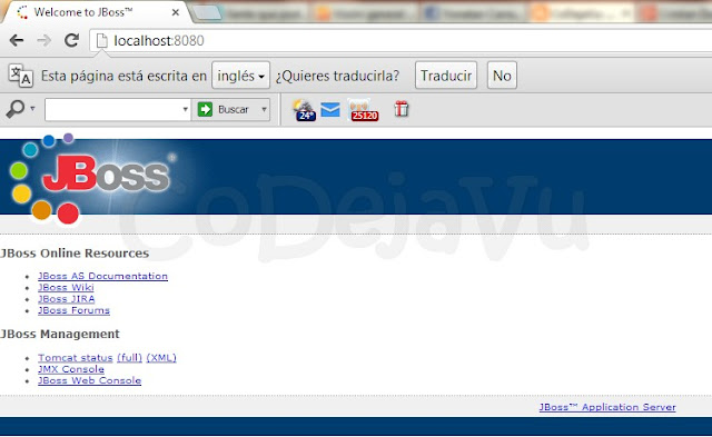 en estos momentos con el servidor arriba, podemos verificar la pagina de administración del JBoss, para eso ingresamos en algún explorador al localhost:8080 (8080 es el puerto por defecto del servidor, si queremos puede ser modificado)