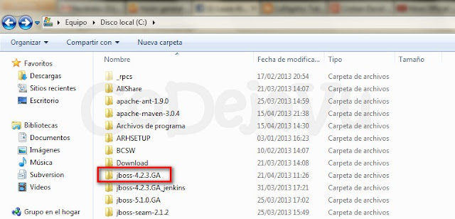 En la Imagen anterior, vemos que en mi máquina tengo tres servidores JBoss (No confundirlo con el Framework JBoss Seam), dos con versión  4.2.3.GA y uno con 5.1.0, además le cambie el nombre de la carpeta a uno de ellos, esto no nos presentara ningún tipo de inconveniente ya que se tiene que definir cual es el servidor que queremos usar por medio de la variable de entorno JBOSS_HOME.