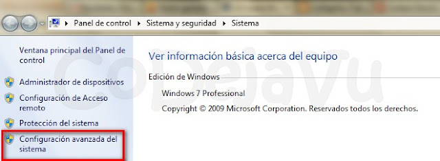 para esto, vamos a «Panel de Control/Sistema y seguridad/Sistema/Configuración avanzada del sistema» (o simplemente para evitar tanto camino……. click derecho en MiPc y Propiedades y listo… )